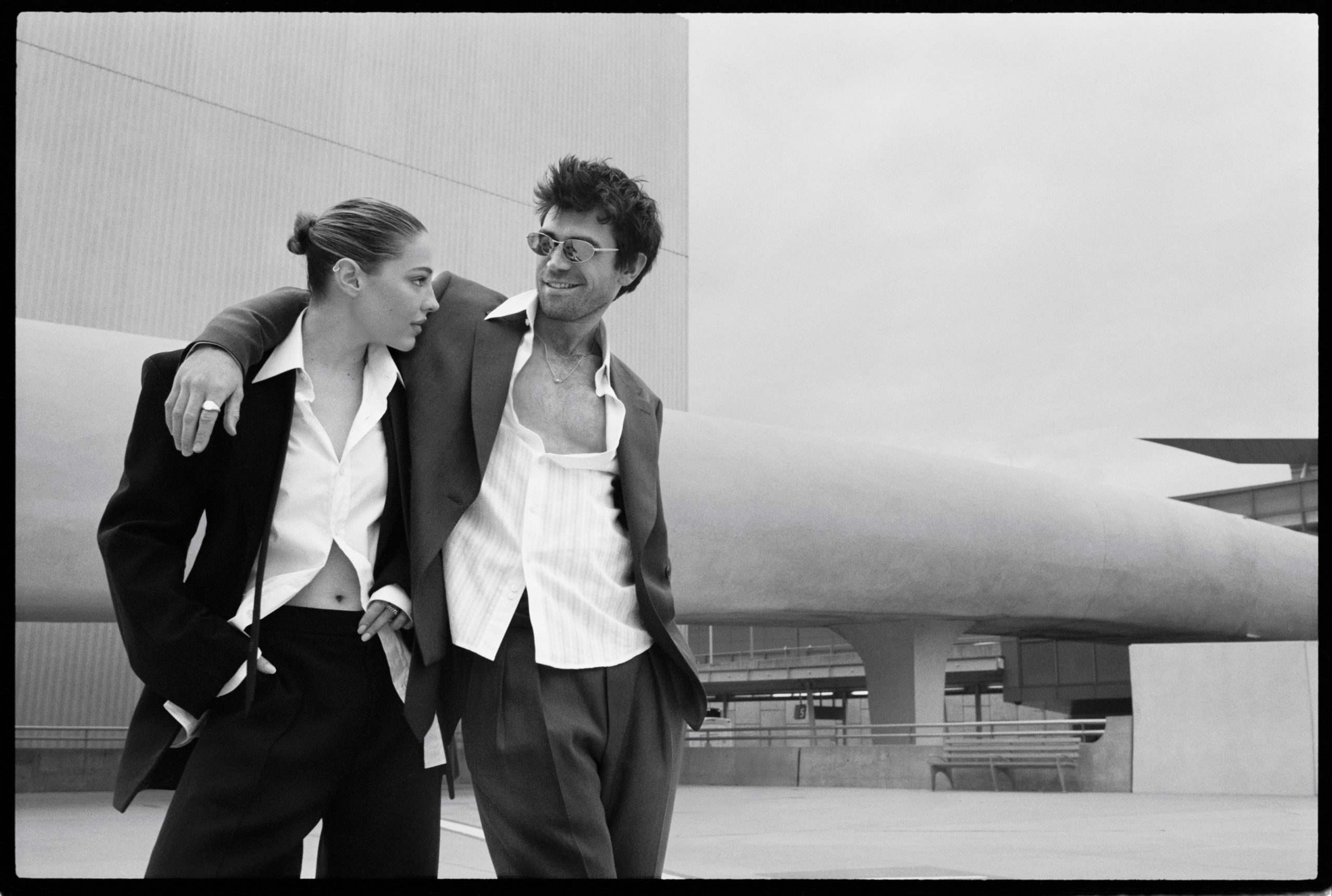 (Title Image) On Madelyn: Mugler blazer and pants, Tom Ford shirt, Hermès tie, Madelyn’s own earring (worn throughout), Cartier ring. On KJ: Paul Smith blazer and pants, Carter Young shirt, Ray-Ban sunglasses, David Yurman jewelry. (Cover Image) On Madelyn: Khaite coat, t-shirt from The Society Archive, R13 shorts, Falke tights, Hermès boots, Bulgari necklace. On KJ: Loewe jacket and pants, t-shirt from The Society Archive, Frye boots, David Yurman jewelry.